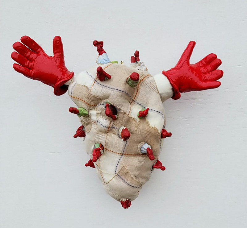 Metal frame, galvanized wire, cotton string, recycled canvas, burlap, washi tape, paper mache, clay, embroidery thread, found objects, acrylic