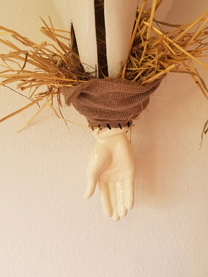 Bison skull epoxy, vintage gloves and child's dress, baler twine, poly fiberfill, felt and galvanized wire